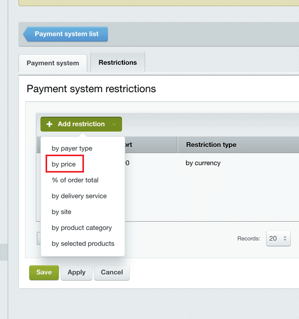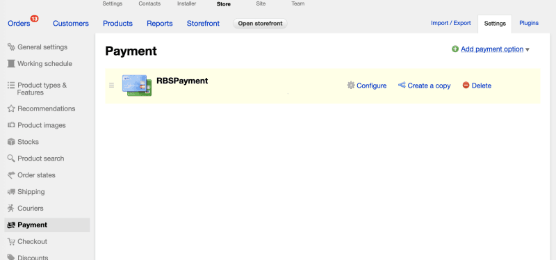 - Sign in to Webasyst administrative panel. Select "Store", and at the top right-hand corner click on Settings. In the side menu on the left, select Payment>Add payment option.