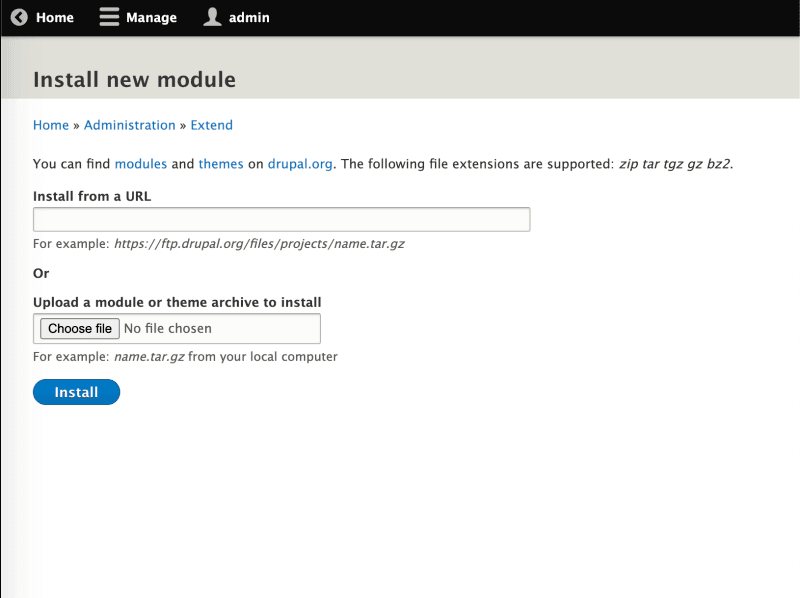 - In the opened Manual installation page click Local, select the downloaded archive and click Upload & install.