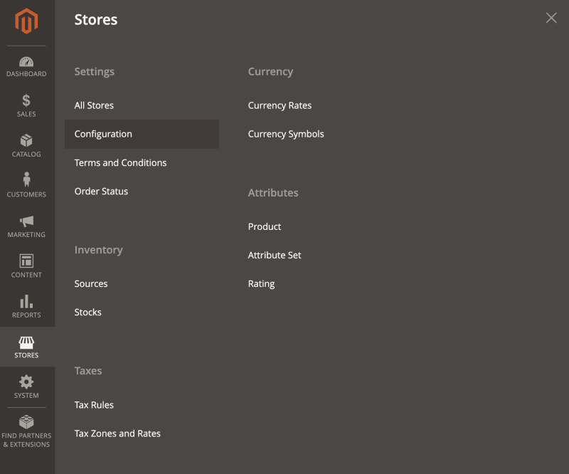 - In the left menu select Stores > Configuration (see the figure below).
