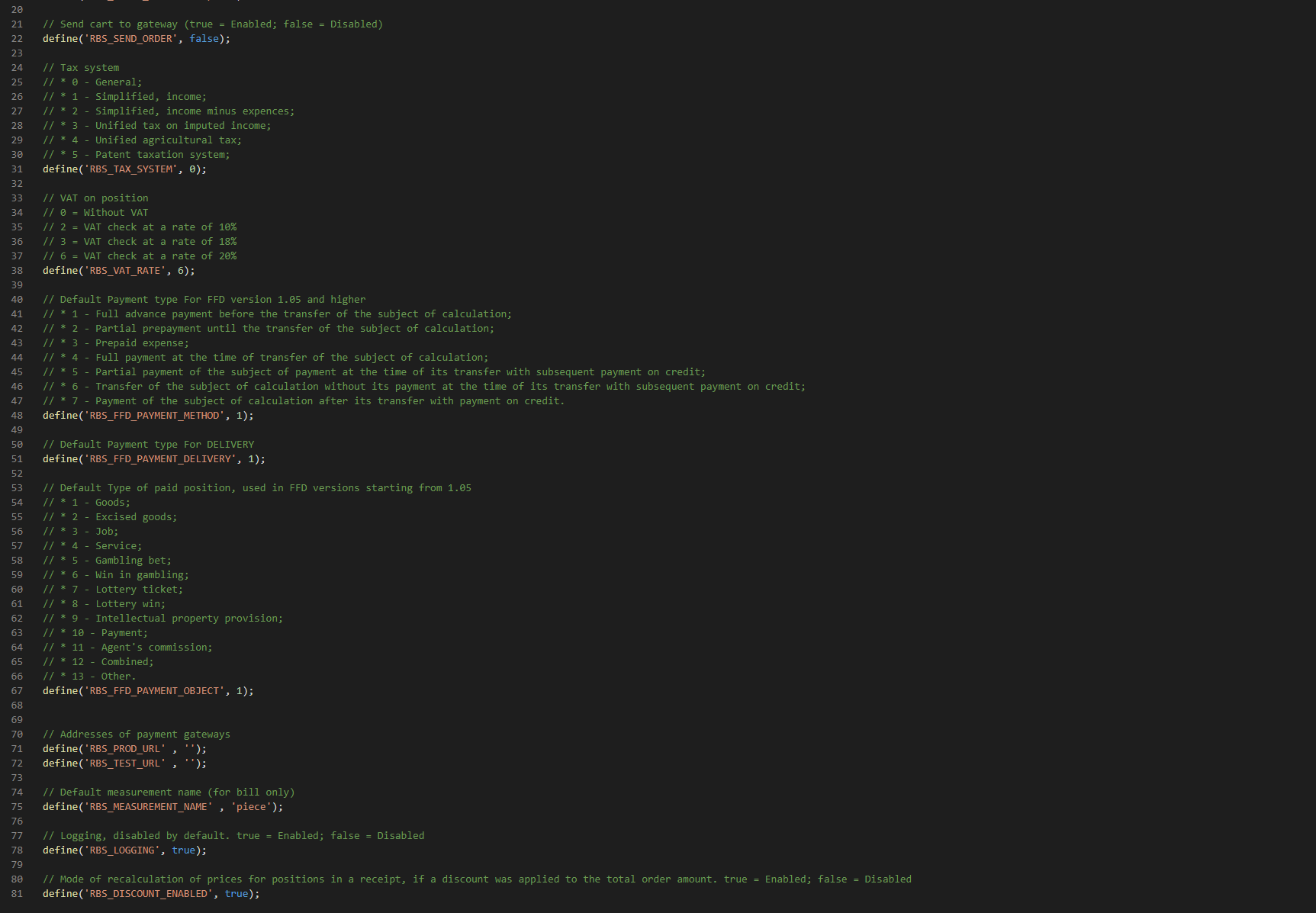 The settings below are related to taxation and shopping cart. They may or may not be displayed, depending on the global plugin setting in \wa-plugins\payment\paypayment\lib\config\include.php file. The parameter defining this is define('PAY_ENABLE_FISCALE_OPTIONS', true);. Default value is true, but it can be changed to false in order to hide these settings.