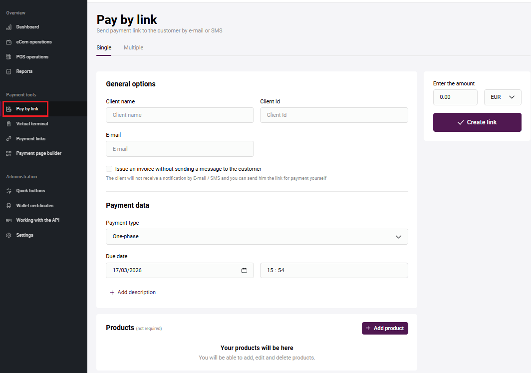 When generating an invoice, you can add a shopping cart for the order. The Products section is located below the area for creating a link to payment page: