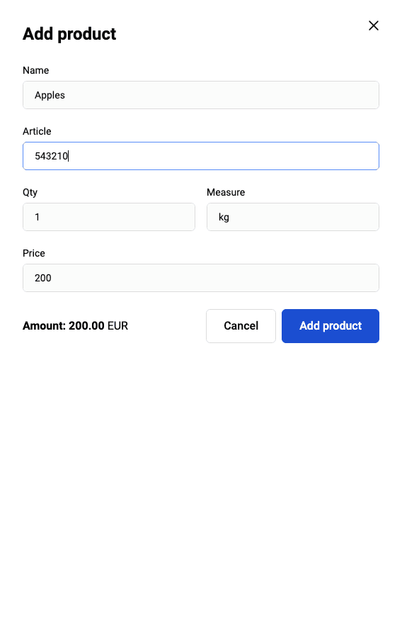 Field Description Name Product/service name. Mandatory field. Article The vendor code of the product. Mandatory field. Qty The number of units of the product. Mandatory field. Measure Units of measurement, for example: L – liters, pcs. – pieces. Mandatory field. Price Price of one product unit. Mandatory field. Amount Total amount for all units of one product item. Calculated automatically when filling in the Price and Qty fields. If you have configured fiscalization, fill in (optionally) the following fields (the set of values may slightly differ depending on the FFD version):